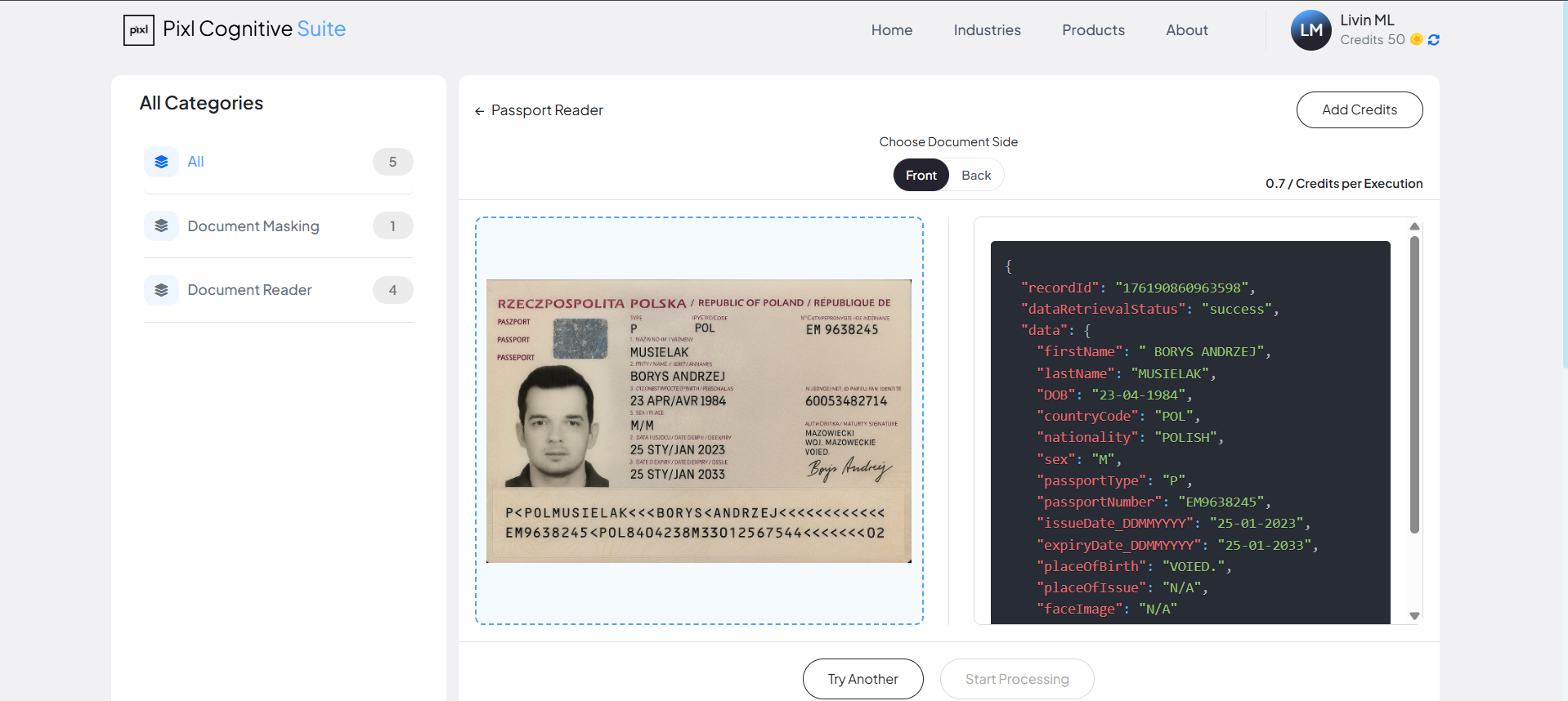 The Passport OCR API from Pixl Cognitive Suite (PCS) is an effective, reliable, and secure tool for automating passport data extraction. With 50 free credits in your trial, you can process hundreds of passports, explore the API features, and improve verification efficiency without any initial investment.